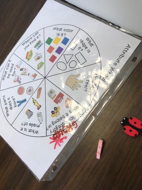 I consider this a sort of a higher level describing task. I use it with my students that have a lot of the vocabulary for describing, but need reminders to elaborate more than just "something yellow and smooth." I pull out this describing wheel from The Dabbling Speechie, pictured below: