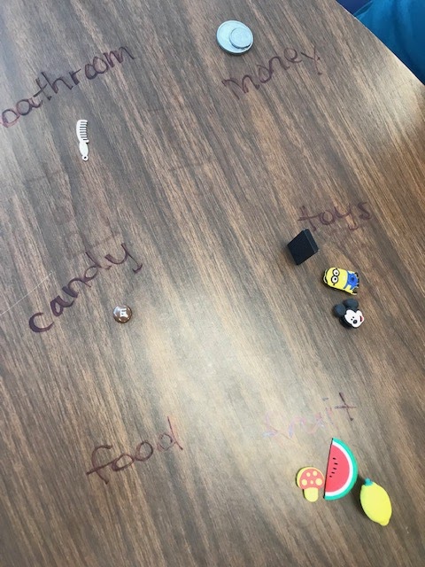 It can be so hard to begin teaching students how to categorize items when they're first learning vocabulary. Having a mini object to see, feel, and hold is so much more tactile than a simple 2D picture of items. In the image below, I pulled out a mini object and my student named the category. I quickly wrote it on the table, and we began sorting. So simple and engaging!