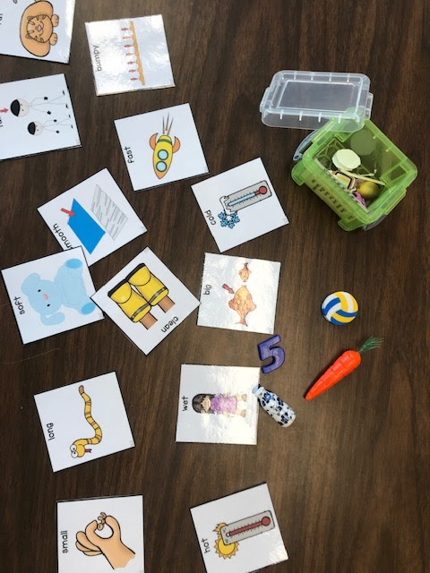 This student is working on describing various objects, including the carrot and a ball, using the specific adjective cards. I can get SO much more language from my students when I help them along with visuals #obsessedwithvisuals