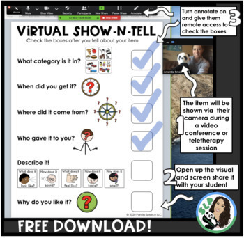 I'll be using this incredible freebie from Panda Speech so that we can extend our show-and-tell activity! This freebie will give my students tons of opportunities for describing, and relating the item (no matter what it is!) to speech goals. I'll simply screen share this document and annotate as we go through each part.